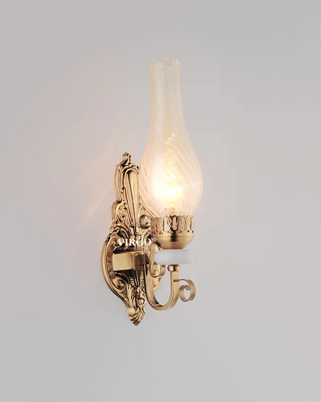 Đèn Tường Thủy Tinh Cổ Điển: Chao đèn có họa tiết vân nổi hoặc được uốn lượn, thường đi kèm khung đồng hoặc vàng đồng, tạo vẻ đẹp lãng mạn.