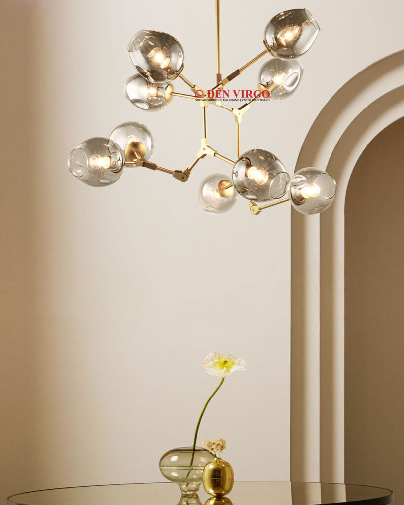 Đèn chùm trang trí thân vàng chụp thủy tinh khói 9 bóng hiện đại LV8085/9